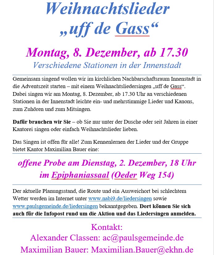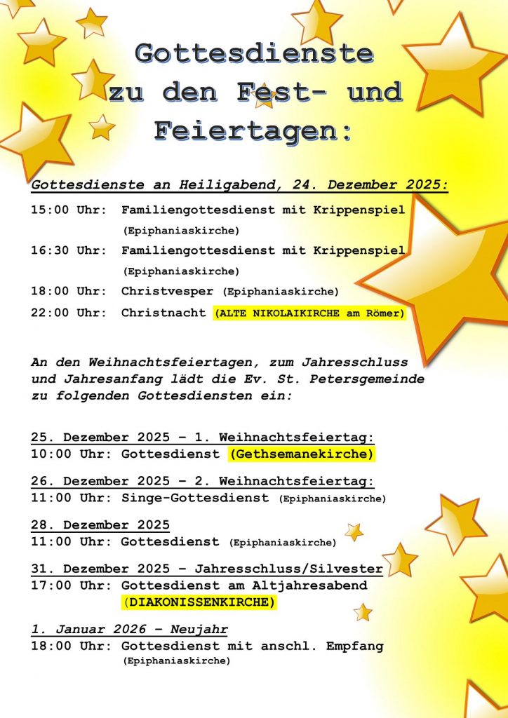 (in der Regel): zweiter Sonntag im Monat, 14 Uhr, im Epiphaniassaal (Oeder Weg 154)
